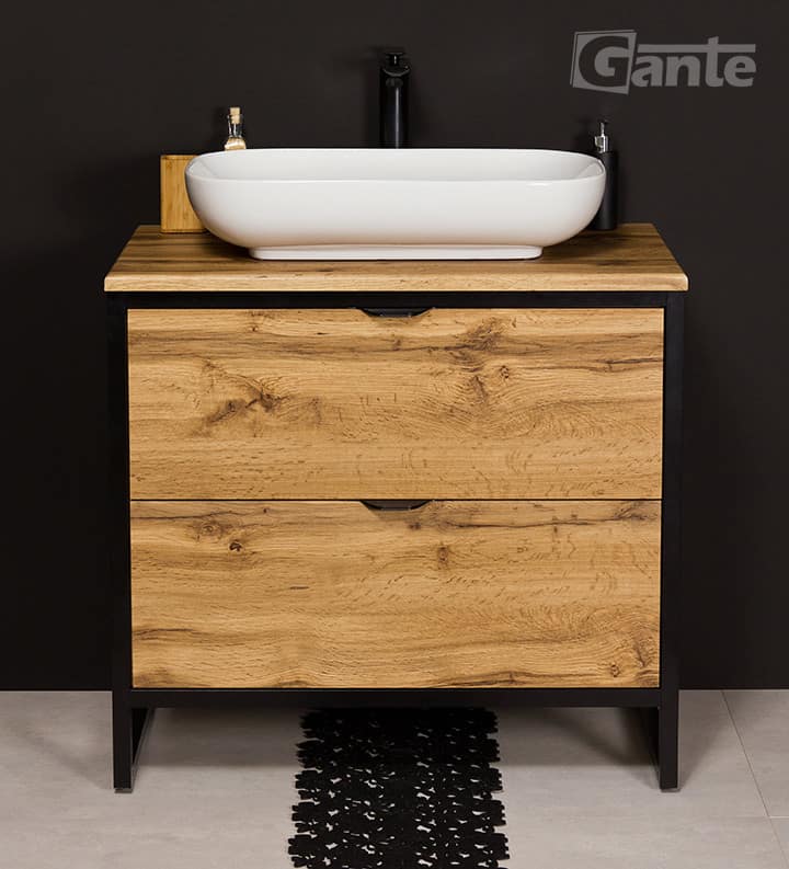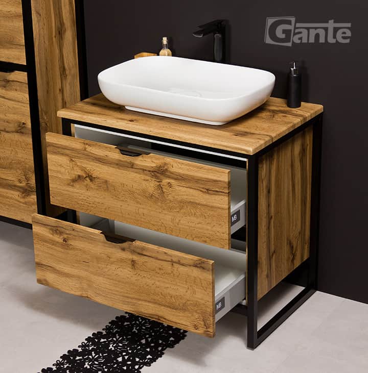The New York bathroom furniture line is an offer for people who appreciate modern style. Referring to the loft-style – a combination of practicality and simplicity characteristic of the early industrial era – it works great both in small and big bathrooms. The simple, aluminum frame has been powder coated in black matt: this durable varnish layer protects the material from damage, but above all, it gives an extraordinary aesthetic impression. The furniture boards are finished in the color of natural oak: a material that has become synonymous with durability and resistance to destruction. Furniture boards are – in contrast to raw wood – resistant to moisture and temperature changes, which is why they are even better suited to bathrooms.