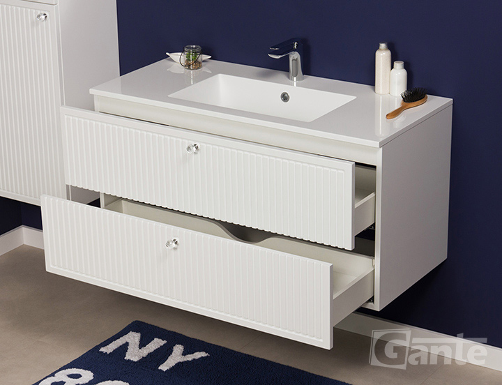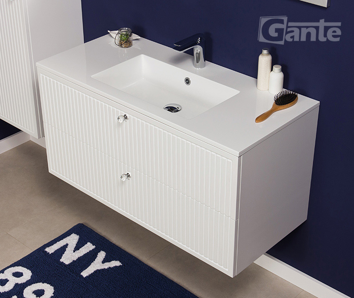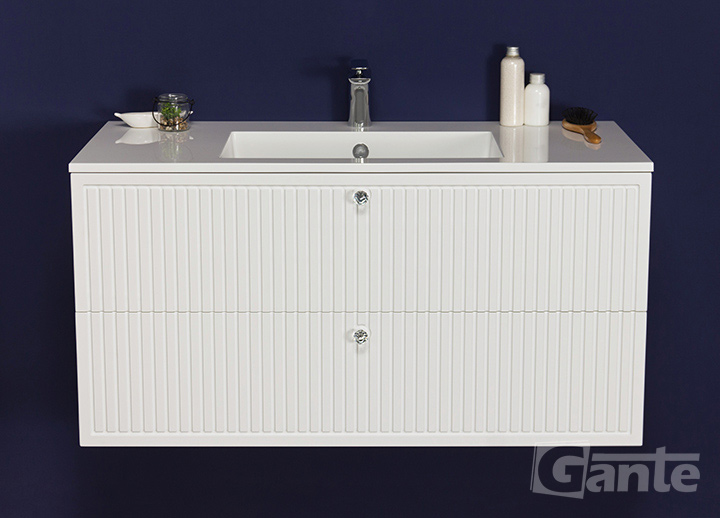 The series of exclusive Argento bathroom furniture has been designed in such a way as to give the classic design a modern character. The white finish with cutters imitating lamellas perfectly reflects the spirit of simple furniture from years ago. Flawless texture of the furniture foil, which finishes fronts of bathroom furniture, is characteristic only for the best designs on the market. Small crystal handles in the form of cut knobs refract the light beautifully, adding a unique charm to the furniture. They are very modern and make Argento bathroom furniture truly extraordinary at first glance. The cabinets are combined with the highest quality dolomite sink that is embedded in the countertop.