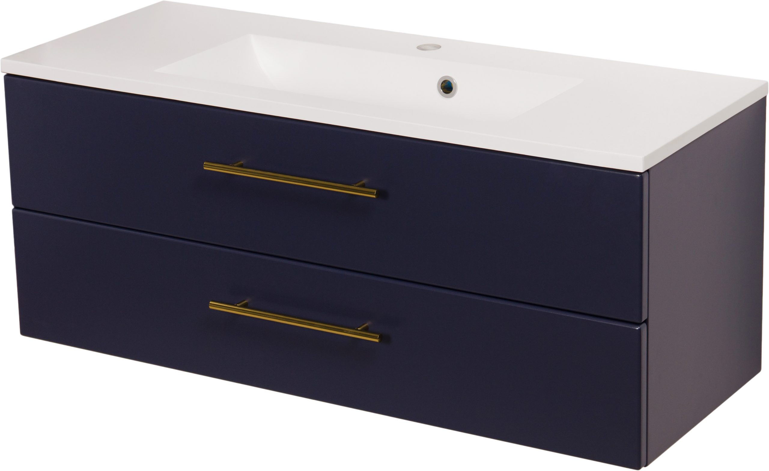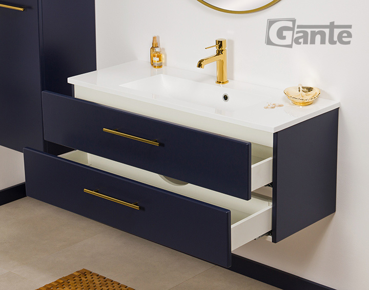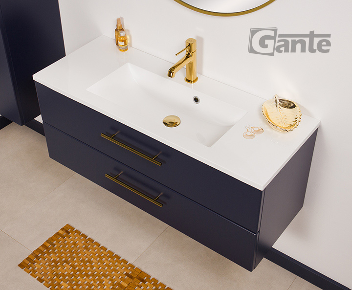 Bathroom furniture from the Belli Gold series is a pleasant combination of classic shapes with modern materials, innovative furniture accessories, and distinctive, bold colors. In the design of the entire series, an important place is occupied by comfortable, golden furniture handles, which in every color variant of the furniture boards make the Belli Gold series elegant and modern at the same time. The combination of the vivid, energetic color of gold with matte white, black, or navy blue allowed to create furniture that in general refers to classicist traditions, but at the same time fits well into rich, nonchalant, and avant-garde modern interiors. The use of matte finishes and flush-mounted sinks ensured a fuller, contrasting finish and preserve the strong character of the entire project.