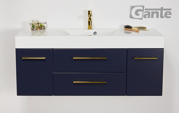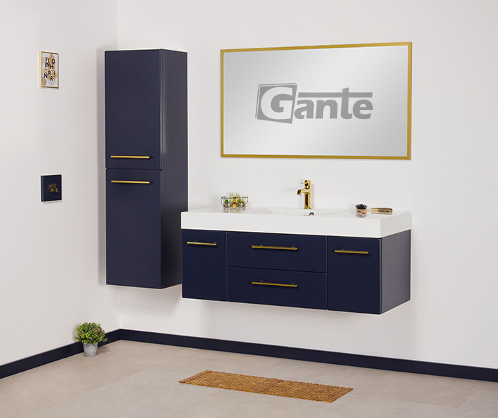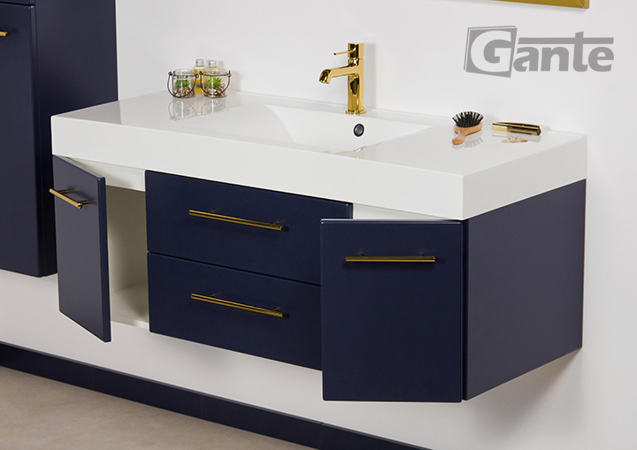 Bathroom furniture from the Belli Gold series is a pleasant combination of classic shapes with modern materials, innovative furniture accessories, and distinctive, bold colors. In the design of the entire series, an important place is occupied by comfortable, golden furniture handles, which in every color variant of the furniture boards make the Belli Gold series elegant and modern at the same time. The combination of the vivid, energetic color of gold with matte white, black, or navy blue allowed to create furniture that in general refers to classicist traditions, but at the same time fits well into rich, nonchalant, and avant-garde modern interiors. The use of matte finishes and flush-mounted sinks ensured a fuller, contrasting finish and preserve the strong character of the entire project.