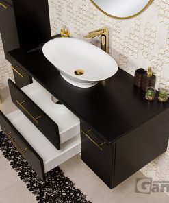 In Belli Gold bathroom furniture, a refined, attractive design goes hand in hand with technical excellence and precision of workmanship, which guarantees many years of trouble-free use. The body of the furniture is made of the highest quality furniture boards, secured with a great-looking, moisture-resistant, and mechanical-damage-resistant matt furniture foil. The hinges and guides in all doors and drawers are equipped with a soft-close system. The precisely machined handles are free from sharp edges, and their fixings are very stable and properly seated. Hanging cabinets are constructed in such a way as to withstand even significant loads and the high quality of finishing means that the Belli Gold series furniture for years does not show any serious signs of wear. It is a special series of bathroom furniture that has been designed and constructed for investors who appreciate above-average quality, but who want each bathroom to have its charm and character.