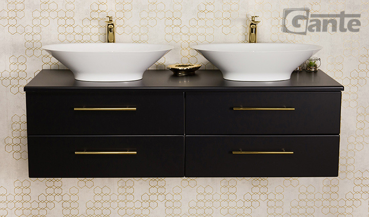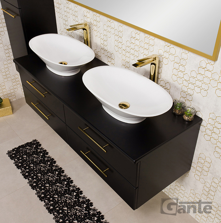 Bathroom furniture from the Belli Gold series is a pleasant combination of classic shapes with modern materials, innovative furniture accessories, and distinctive, bold colors. In the design of the entire series, an important place is occupied by comfortable, golden furniture handles, which in every color variant of the furniture boards make the Belli Gold series elegant and modern at the same time. The combination of the vivid, energetic color of gold with matte white, black, or navy blue allowed to create furniture that in general refers to classicist traditions, but at the same time fits well into rich, nonchalant, and avant-garde modern interiors. The use of matte finishes and flush-mounted sinks ensured a fuller, contrasting finish and preserve the strong character of the entire project.