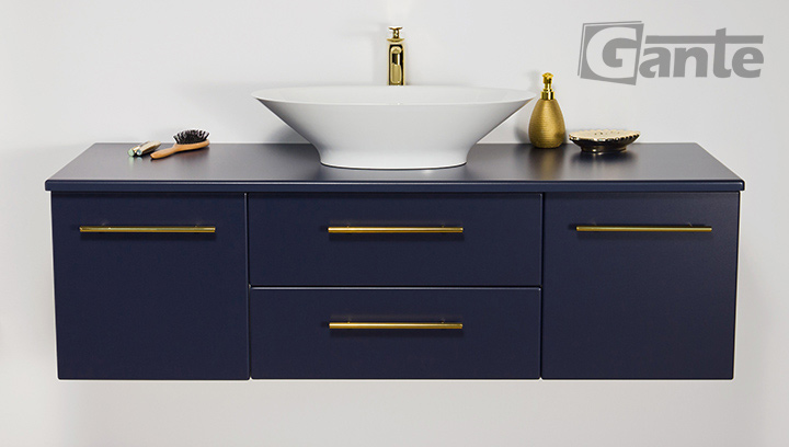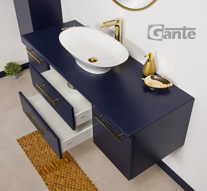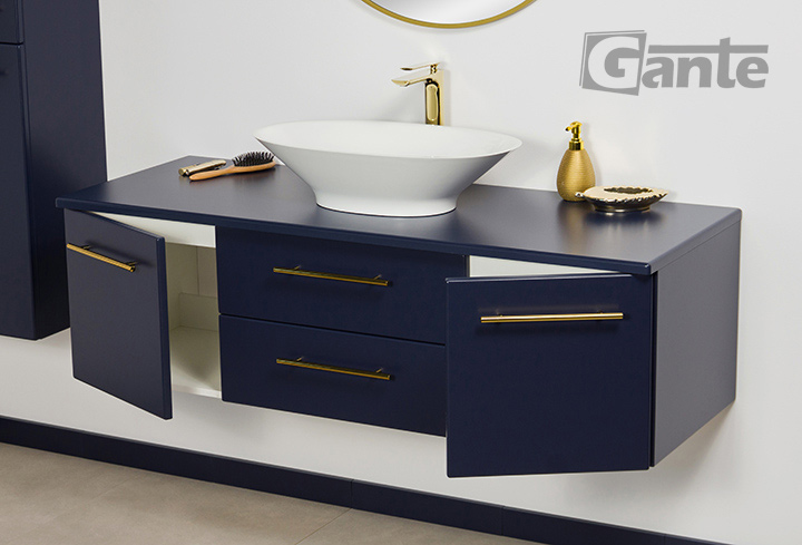 Bathroom furniture from the Belli Gold series is a pleasant combination of classic shapes with modern materials, innovative furniture accessories, and distinctive, bold colors. In the design of the entire series, an important place is occupied by comfortable, golden furniture handles, which in every color variant of the furniture boards make the Belli Gold series elegant and modern at the same time. The combination of the vivid, energetic color of gold with matte white, black, or navy blue allowed to create furniture that in general refers to classicist traditions, but at the same time fits well into rich, nonchalant, and avant-garde modern interiors. The use of matte finishes and flush-mounted sinks ensured a fuller, contrasting finish and preserve the strong character of the entire project.