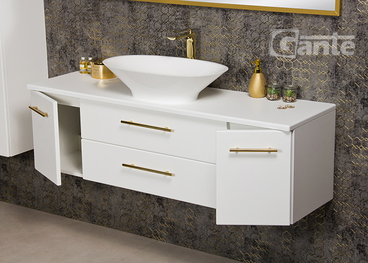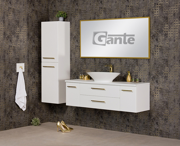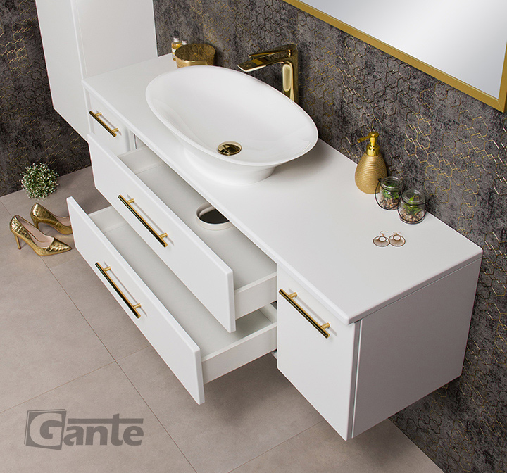 In Belli Gold bathroom furniture, a refined, attractive design goes hand in hand with technical excellence and precision of workmanship, which guarantees many years of trouble-free use. The body of the furniture is made of the highest quality furniture boards, secured with a great-looking, moisture-resistant, and mechanical-damage-resistant matt furniture foil. The hinges and guides in all doors and drawers are equipped with a soft-close system. The precisely machined handles are free from sharp edges, and their fixings are very stable and properly seated. Hanging cabinets are constructed in such a way as to withstand even significant loads and the high quality of finishing means that the Belli Gold series furniture for years does not show any serious signs of wear. It is a special series of bathroom furniture that has been designed and constructed for investors who appreciate above-average quality, but who want each bathroom to have its charm and character.