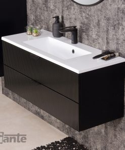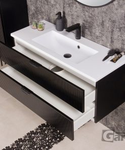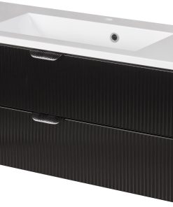 Bravia is a collection of bathroom furniture characterized by modern aesthetics and high quality of materials used. Milled black fronts with a visible pattern of longitudinal slats are a combination of a three-dimensional effect with a stylish design and exceptional resistance. Additionally, the fronts are made of tempered glass, which further enhances the originality and uniqueness of the entire series. This solution makes bathroom fronts perfect for almost any style, further enhancing their use. Depending on your choice, bathroom cabinets and a shelf are available with black or gold handles. Delicately decorated, they add sophistication to the furniture and at the same time emphasize their unique appearance and character.