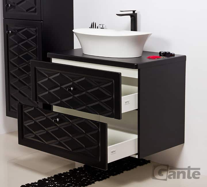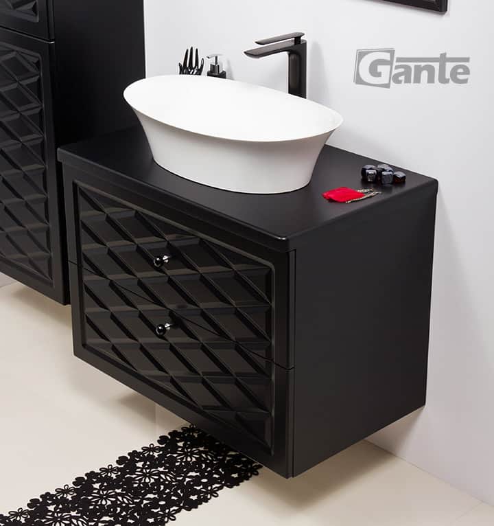Cobra is a unique line of bathroom furniture. Glamourous style with deep cutters arranged in a rhomboidal pattern. Available in matt colours: black or white, add subtle charm. Cabinets are sold complete with a counter top ceramic or dolomite washbasin, whose glossy surface is a spectacular contrast to furniture boards. The decisive, full-bodied with rounded edges and finished with small handles made of polished glass attract the eye and make that even if the other elements of the decor are quite simple, the whole bathroom arrangement takes on the third dimension and becomes more interesting, richer and inspiring. The glass handles themselves are made in a pattern aesthetically consistent with the cutter motif on the front, which allows multiple refractions and reflection of light giving the impression of extraordinary complexity. Symmetrical blocks divided into equal-sized elements are not flashy – they provide a simple, aesthetic background for expressive decorations of the fronts.