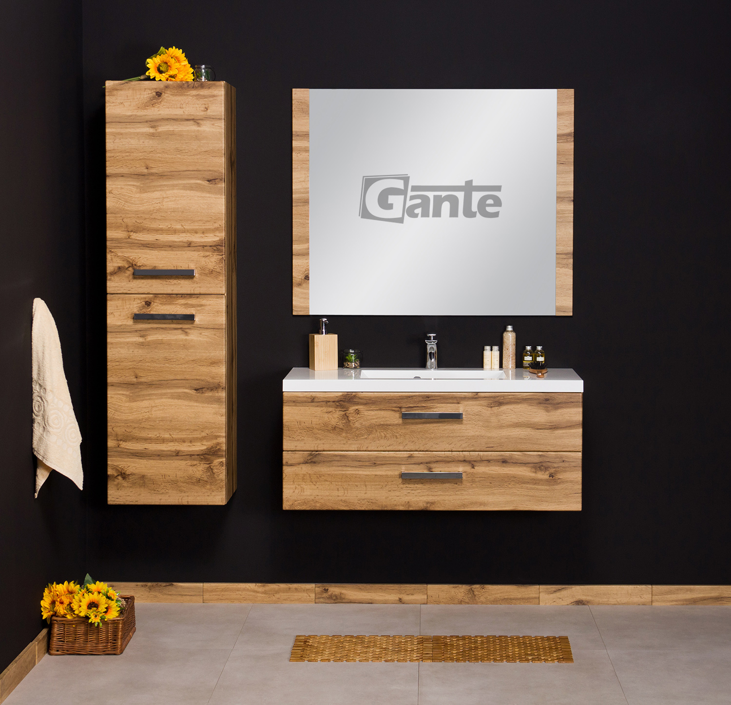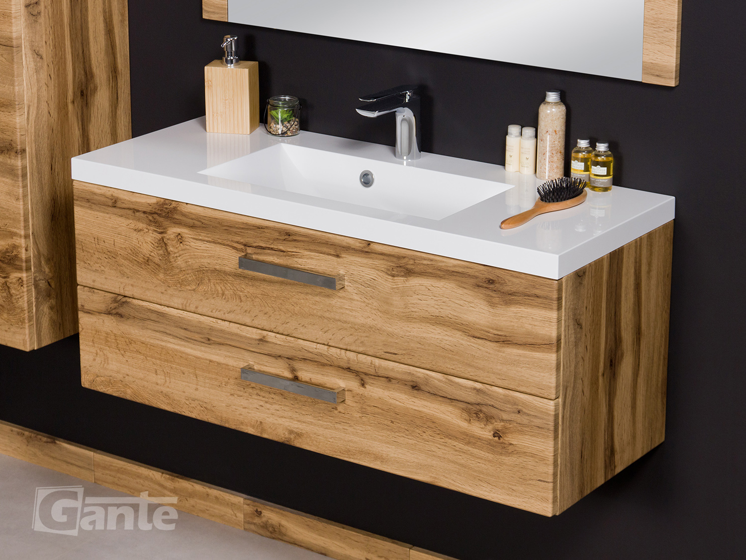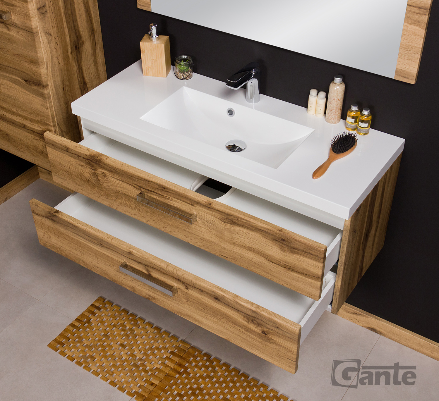 In this line, we have 7 colours for vanity units (antique wood, white, black, red, gray, oak, wenge matt) plus 2 colours for basins- white and black.