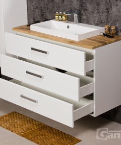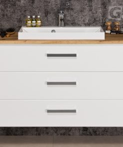 FOCUS is our main line of vanity units. Simple in form yet with endless possibilities. The ergonomic handle combines a modern accent with classic elegance in the furniture. Various basins shapes emphasize the distinctive design of the furniture. Furniture from the FOCUS line is made of MDF covered with high-quality furniture foil, thanks to which bathroom furniture has increased resistance to moisture. The cabinets are equipped with practical shelves and storage drawers. A wide range of colors and sizes allows you to adjust the furniture to each bathroom. In this line, you have a choice of single, double and triple drawers vanity units in all typical widths plus shelves, cabinets, tall storage units, mirrors, and others.