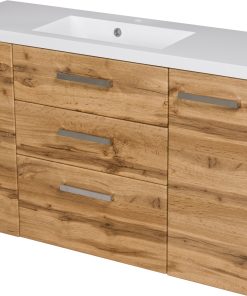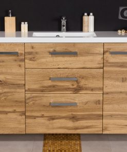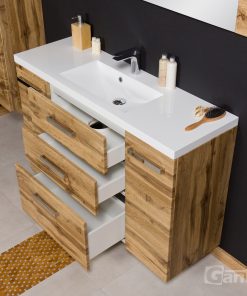 FOCUS is our main line of vanity units. Simple in form yet with endless possibilities. The ergonomic aluminum handle combines a modern accent with classic elegance in the furniture. Various basins shapes emphasize the distinctive design of the furniture. Furniture from the FOCUS line is made of MDF covered with high-quality furniture foil, thanks to which bathroom furniture has increased resistance to moisture. The cabinets are equipped with practical shelves and storage drawers. A wide range of colors and sizes allows you to adjust the furniture to each bathroom. In this line, you have a choice of single and double and triple drawers vanity units in all typical widths plus shelves, cabinets, tall storage units, mirrors, and others.