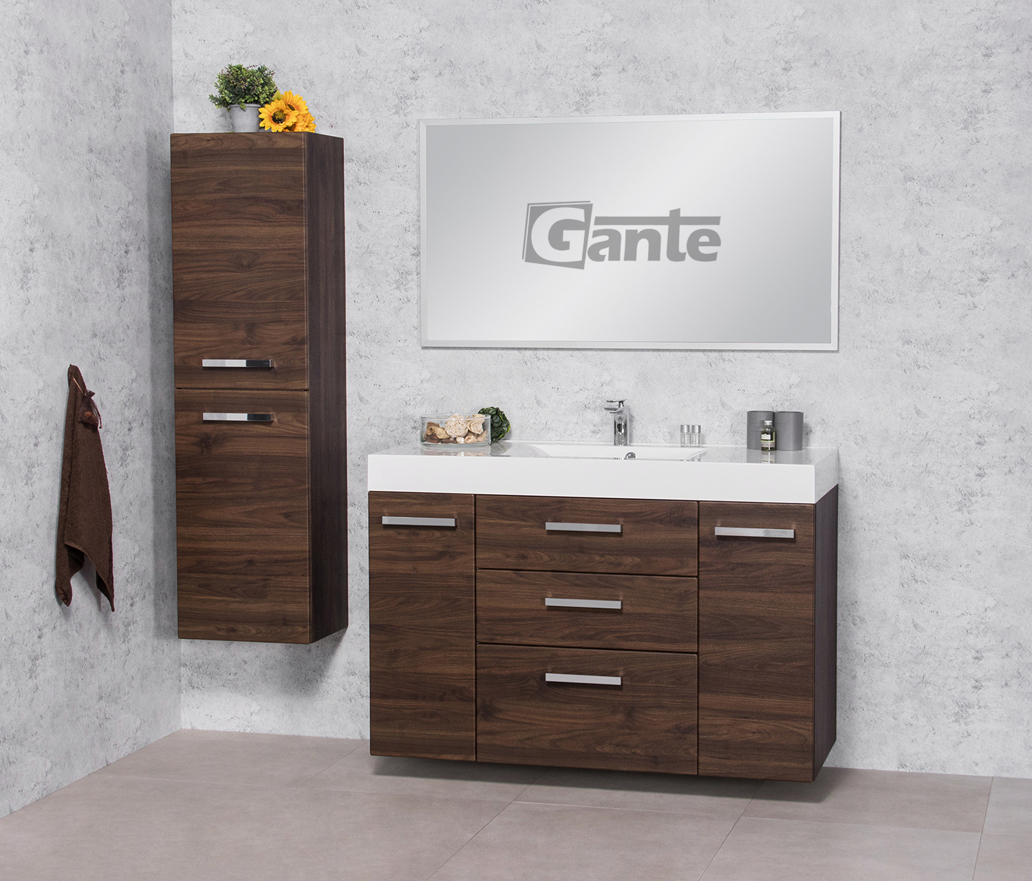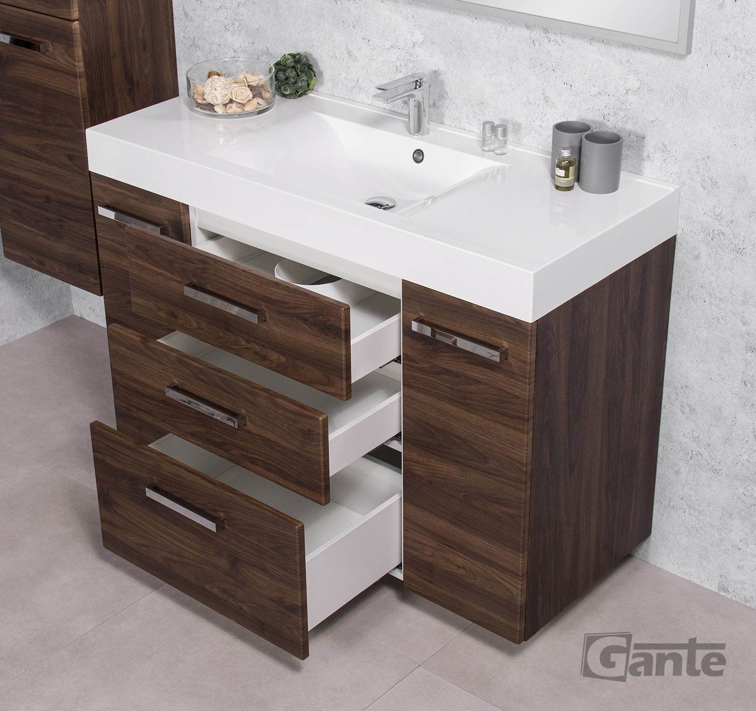 FOCUS is our main line of vanity units. Simple in form yet with endless possibilities. The ergonomic aluminum handle combines a modern accent with classic elegance in the furniture. Various basins shapes emphasize the distinctive design of the furniture. Furniture from the FOCUS line is made of MDF covered with high-quality furniture foil, thanks to which bathroom furniture has increased resistance to moisture. The cabinets are equipped with practical shelves and storage drawers. A wide range of colors and sizes allows you to adjust the furniture to each bathroom. In this line, you have a choice of single and double and triple drawers vanity units in all typical widths plus shelves, cabinets, tall storage units, mirrors, and others.