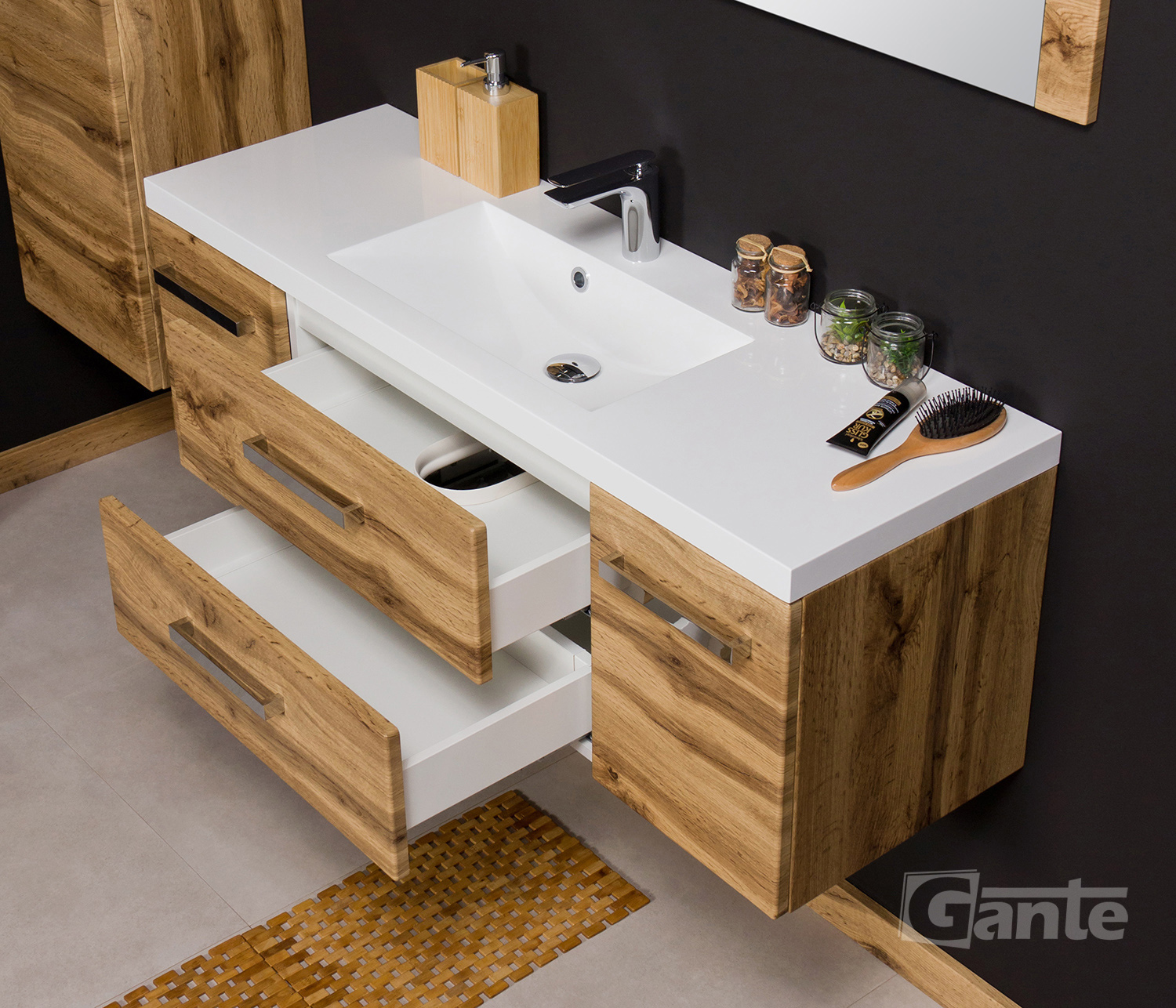 FOCUS is our main line of vanity units. Simple in form yet with endless possibilities. The ergonomic handle combines a modern accent with classic elegance in the furniture. Various basins shapes emphasize the distinctive design of the furniture. Furniture from the FOCUS line is made of MDF covered with high-quality furniture foil, thanks to which bathroom furniture has increased resistance to moisture. The cabinets are equipped with practical shelves and storage drawers. A wide range of colors and sizes allows you to adjust the furniture to each bathroom. In this line, you have a choice of single, double and triple drawers vanity units in all typical widths plus shelves, cabinets, tall storage units, mirrors, and others.