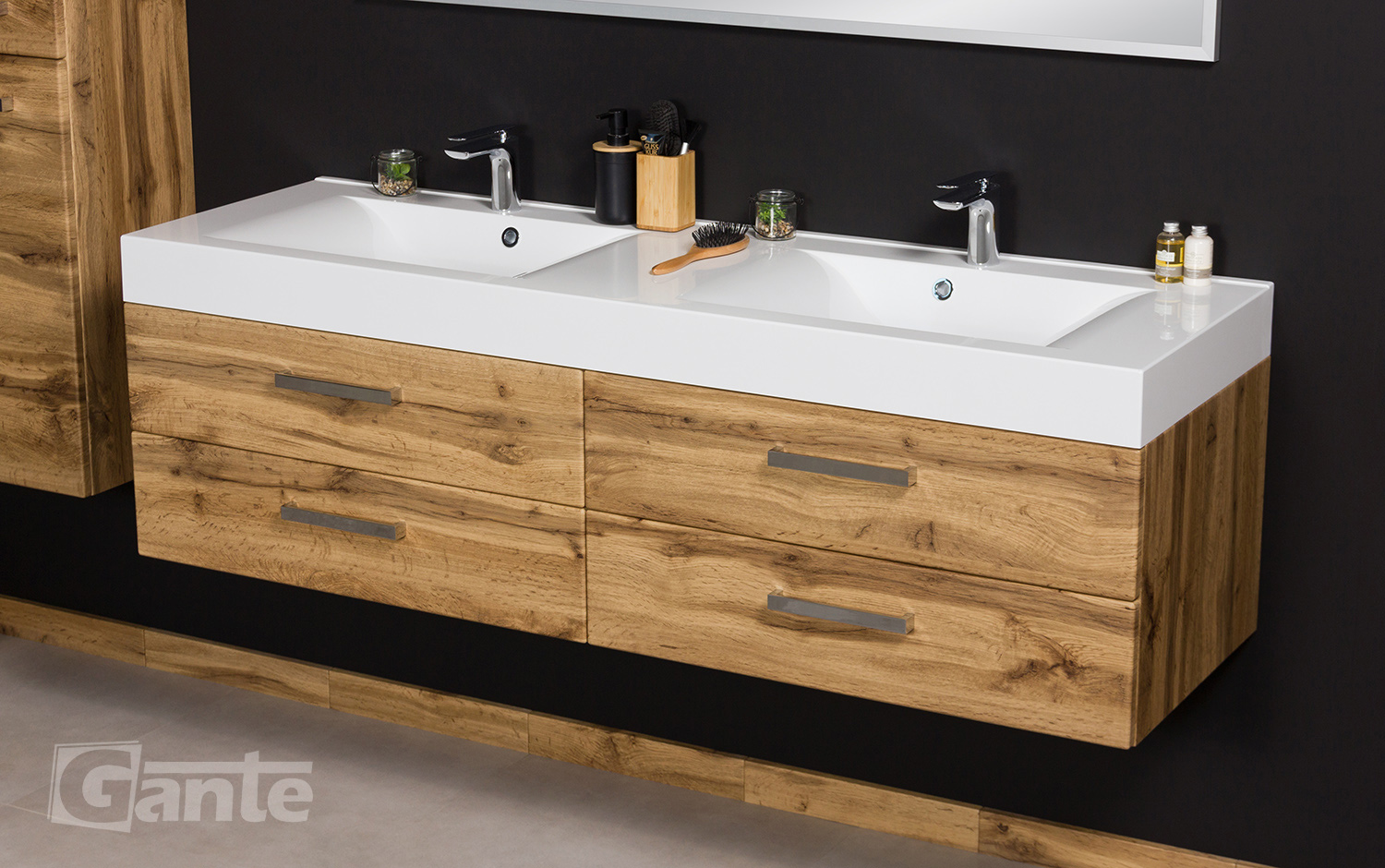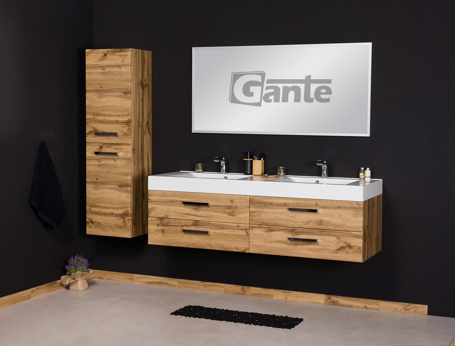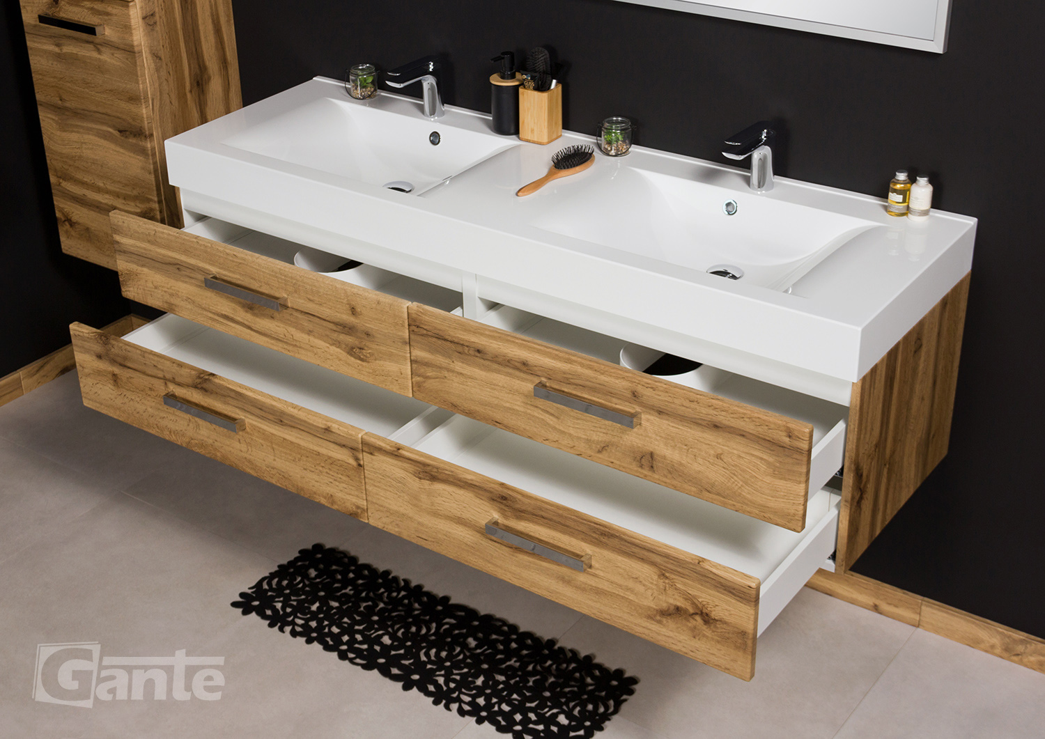 In this line, we have 7 colours for vanity units (antique wood, white, black, red, gray, oak, wenge matt) plus 2 colours for basins- white and black.