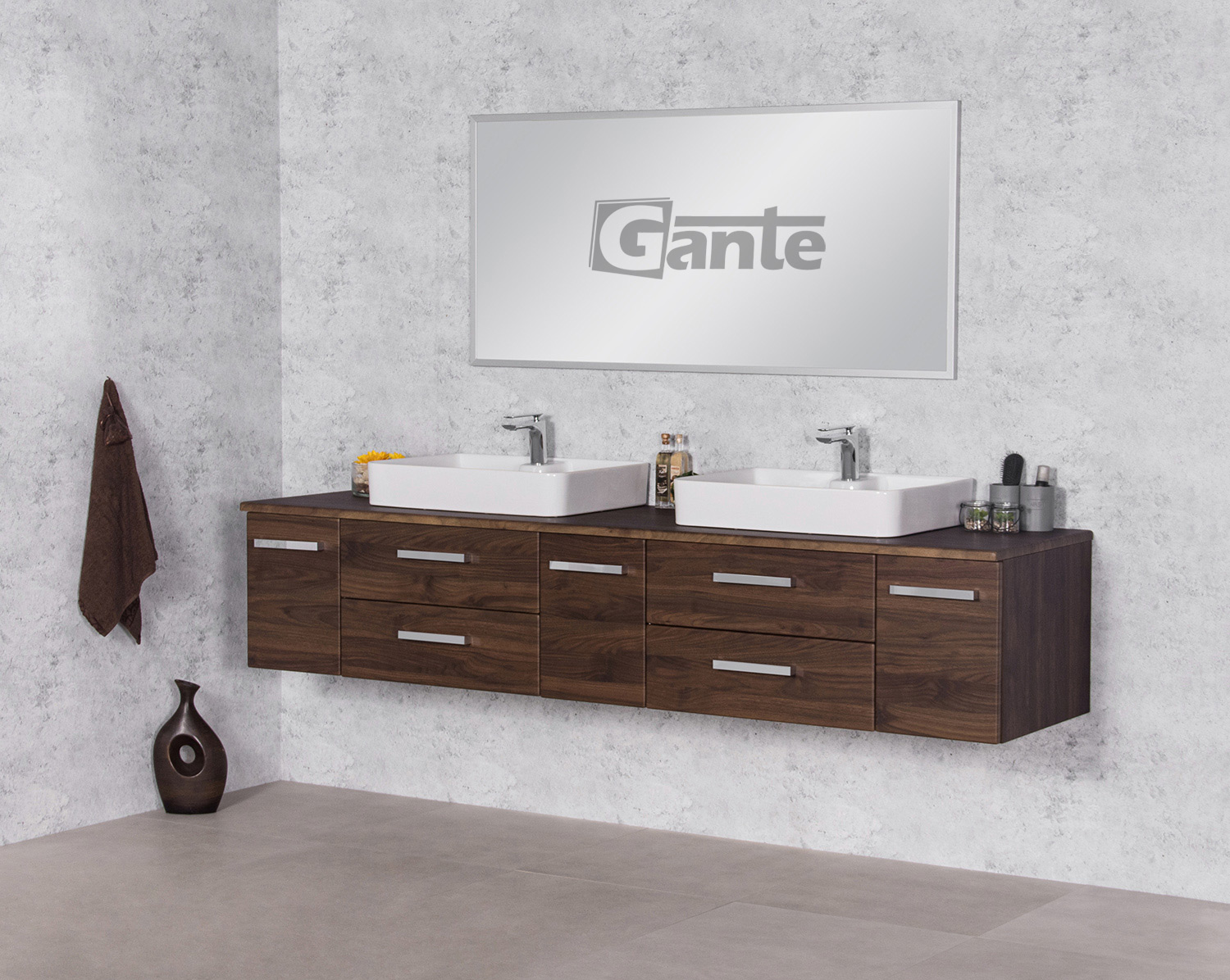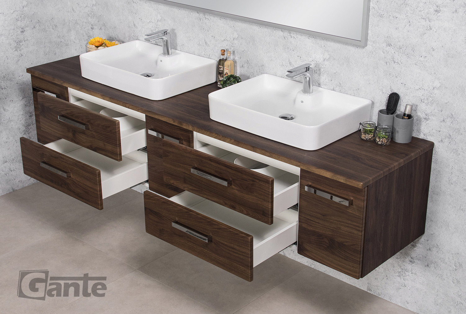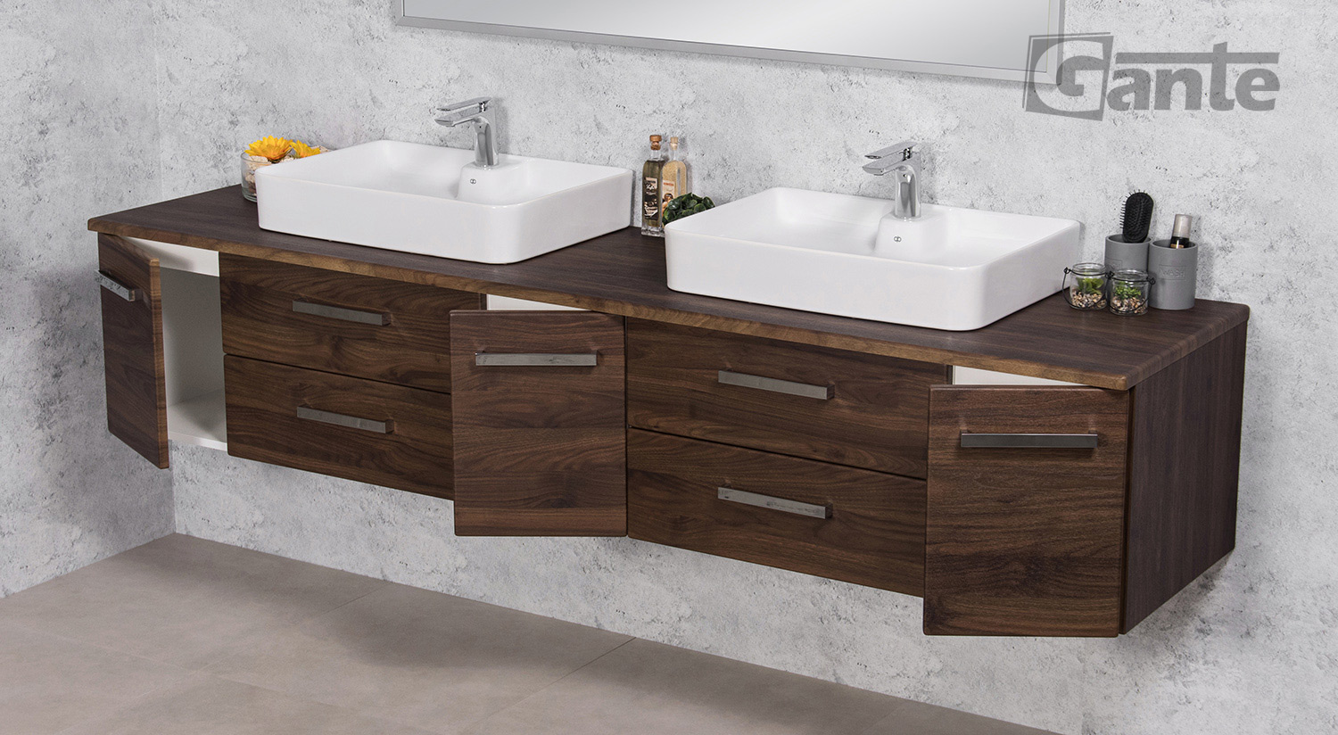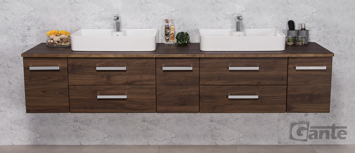 In this line, we have 7 colours for vanity units (antique wood, white, black, red, gray, oak, wenge matt) plus 2 colours for basins- white and black.