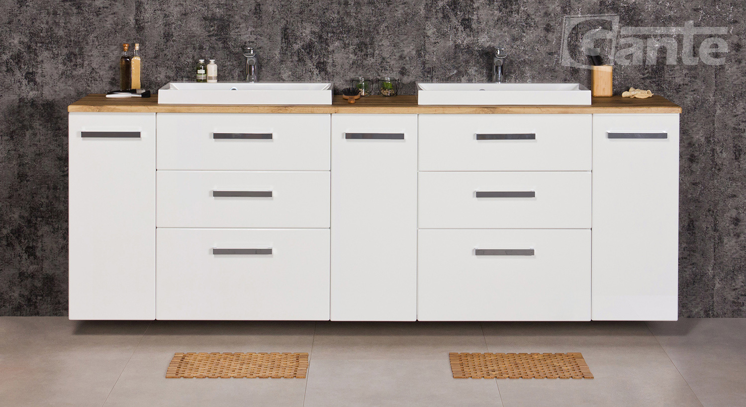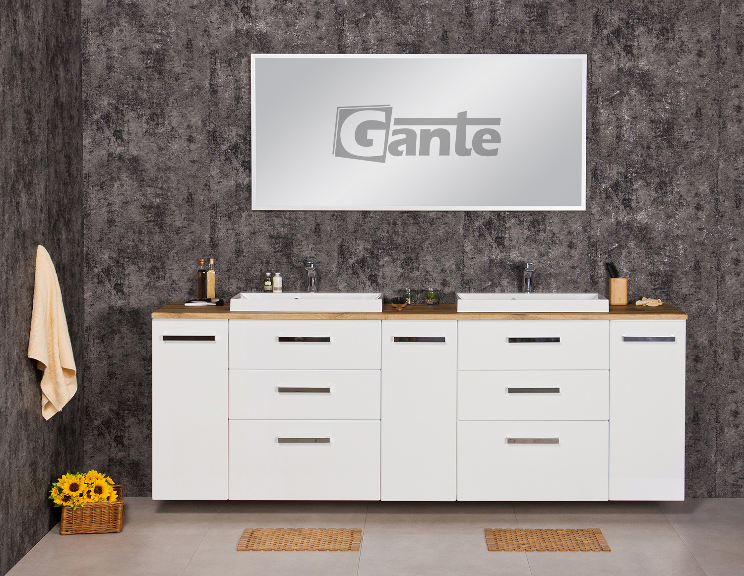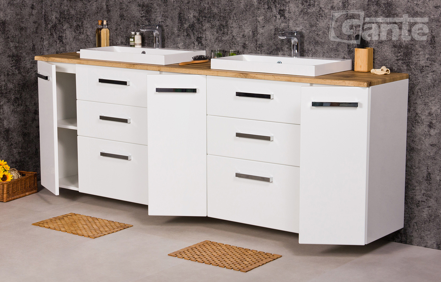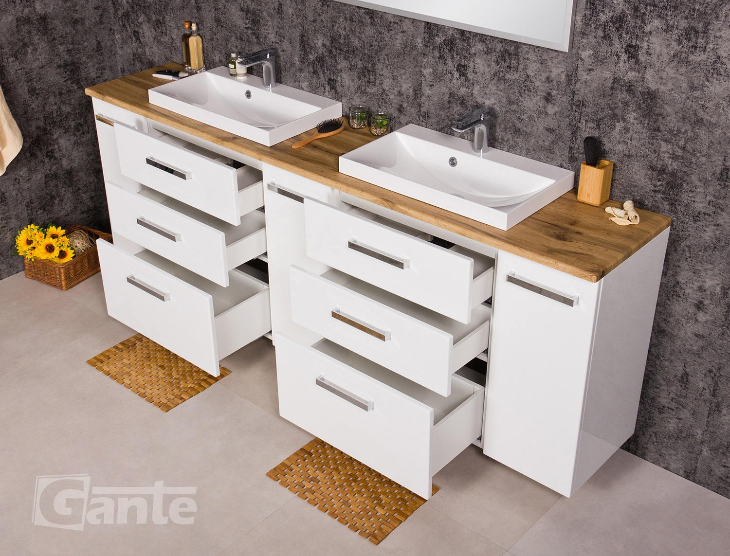In this line, we have 7 colours for vanity units (antique wood, white, black, red, gray, oak, wenge matt) plus 2 colours for basins- white and black.
