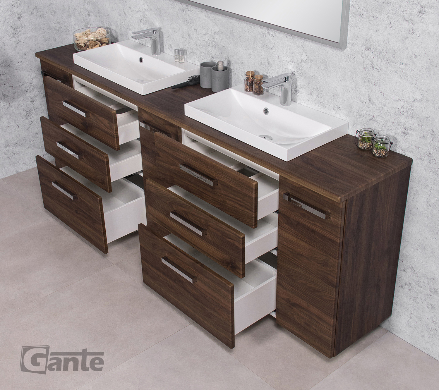 FOCUS is our main line of vanity units. Simple in form yet with endless possibilities. The ergonomic aluminum handle combines a modern accent with classic elegance in the furniture. Various basins shapes emphasize the distinctive design of the furniture. Furniture from the FOCUS line is made of MDF covered with high-quality furniture foil, thanks to which bathroom furniture has increased resistance to moisture. The cabinets are equipped with practical shelves and storage drawers. A wide range of colors and sizes allows you to adjust the furniture to each bathroom. In this line, you have a choice of single and double and triple drawers vanity units in all typical widths plus shelves, cabinets, tall storage units, mirrors, and others.