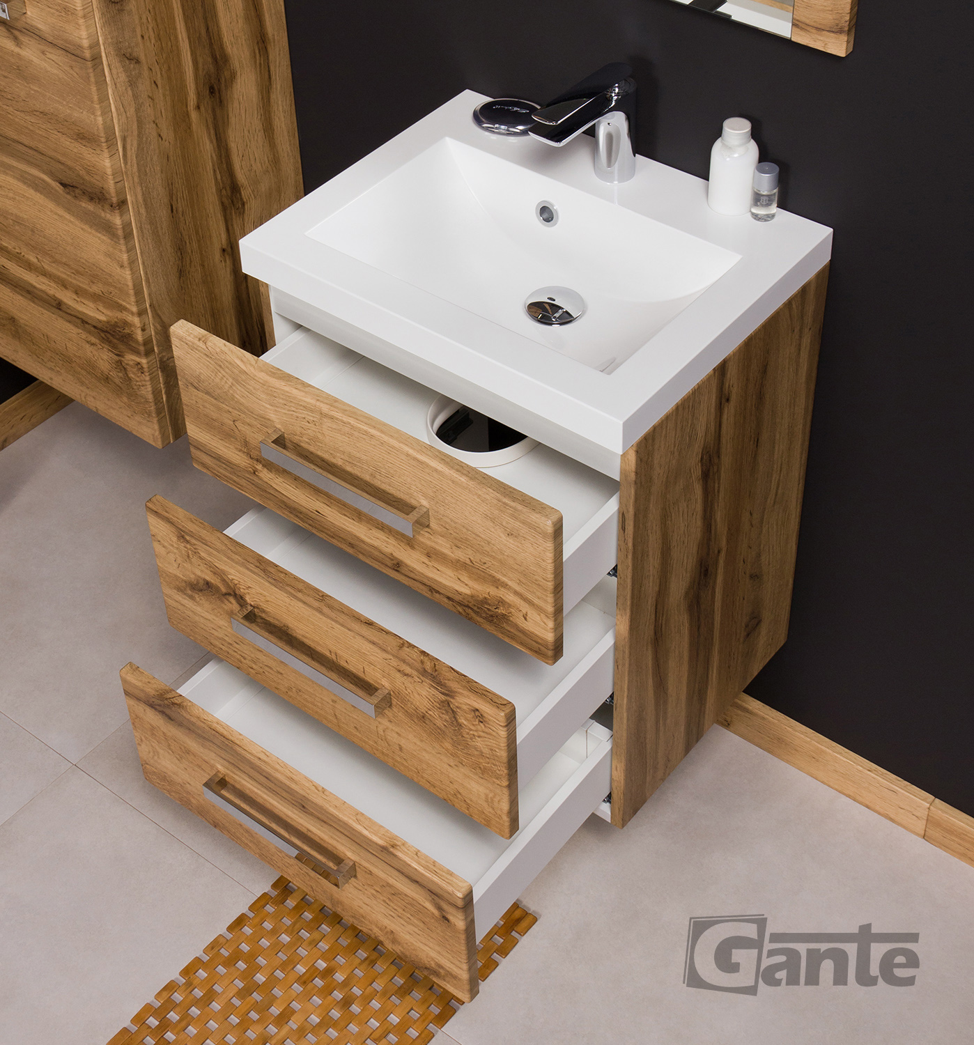 FOCUS is our main line of vanity units. Simple in form yet with endless possibilities. The ergonomic handle combines a modern accent with classic elegance in the furniture. Various basins shapes emphasize the distinctive design of the furniture. Furniture from the FOCUS line is made of MDF covered with high-quality furniture foil, thanks to which bathroom furniture has increased resistance to moisture. The cabinets are equipped with practical shelves and storage drawers. A wide range of colors and sizes allows you to adjust the furniture to each bathroom. In this line, you have a choice of single, double and triple drawers vanity units in all typical widths plus shelves, cabinets, tall storage units, mirrors, and others.