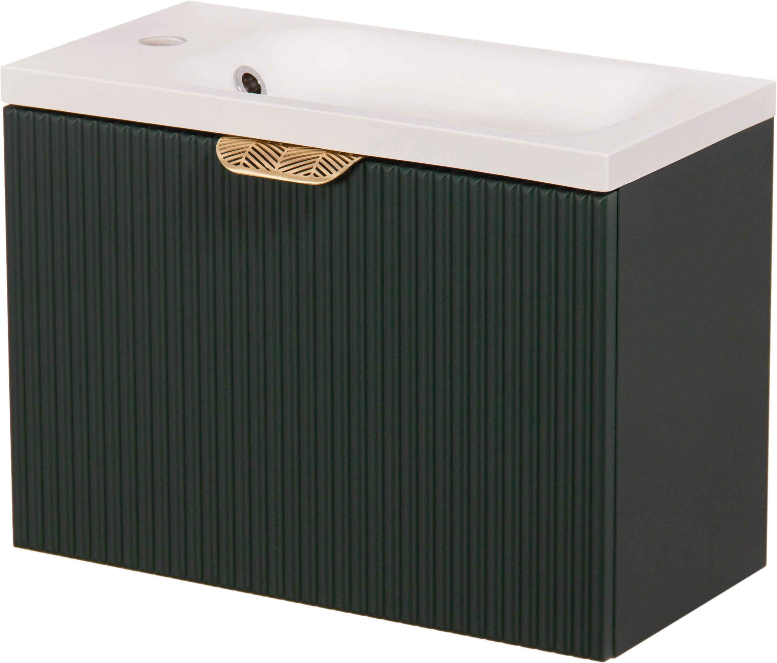 Bathroom furniture from the Fresco Colors collection is distinguished by its color palette. The furniture in this series is available in seven matte colors: black, white, powder pink, bottle green, navy blue, gray and natural oak, so we assure you that even the most demanding investor will have plenty to choose from. The Fresco collection was created mainly for smaller bathrooms and toilets, where every centimeter is worth its weight in gold. Simple and uncomplicated shapes are designed in such a way as to use their internal space to the maximum. The fronts of the cabinets are decorated with symmetrical vertical panels and, depending on the choice, gold or black edge handles. The main idea of the entire project is, above all, aesthetic functionality. Thanks to the use of hinged doors, the cabinets can accommodate even larger containers of cosmetics or cleaning products, because access to the interior of the cabinet is easy and convenient. The use of modern actuators makes opening and closing very smooth and almost silent. The best quality materials were used to produce Fresco bathroom furniture, which extends the durability and operational period while maintaining the unchanged appearance and aesthetics. The decorative foil that protects the MDF furniture board makes all elements of the set extremely resistant to moisture. These small, but very ergonomic and practical pieces of furniture will change the decor of any modern bathroom.