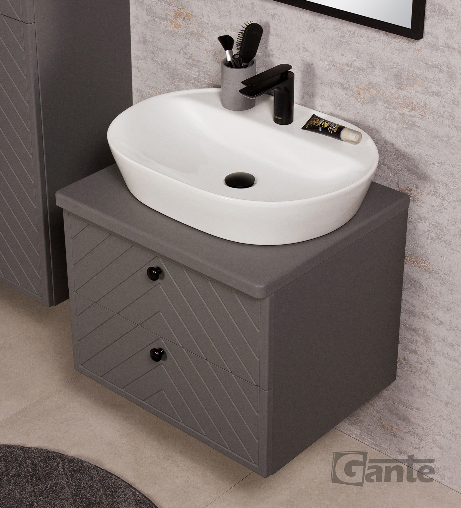 The Kodi series is unusual bathroom furniture that is a brilliant marriage of a classic, simple, functional shape with a well-thought-out, modern, but sublime aesthetics. All furniture in the Kodi series is available in five variants of matte finish: black, white, navy blue, gray and green. The deep matt finish fits perfectly with the wide herringbone. This is a classic, but today rare pattern that perfectly breaks the monotony of straight lines, which fits into the atmosphere of modern interiors, but at the same time is not aggressive enough that it will also blend perfectly in a classic bathroom. The whole is complemented by modest furniture handles in the form of knobs – practical and great-looking. White countertop washbasins add incredible charm – it is definitely a modern solution, but thanks to the use of a classic-shaped bowl, it will also be a good choice in stylistically simpler interiors. A nod to modern design is also the use of drawers instead of classic doors in the washbasin cabinets.