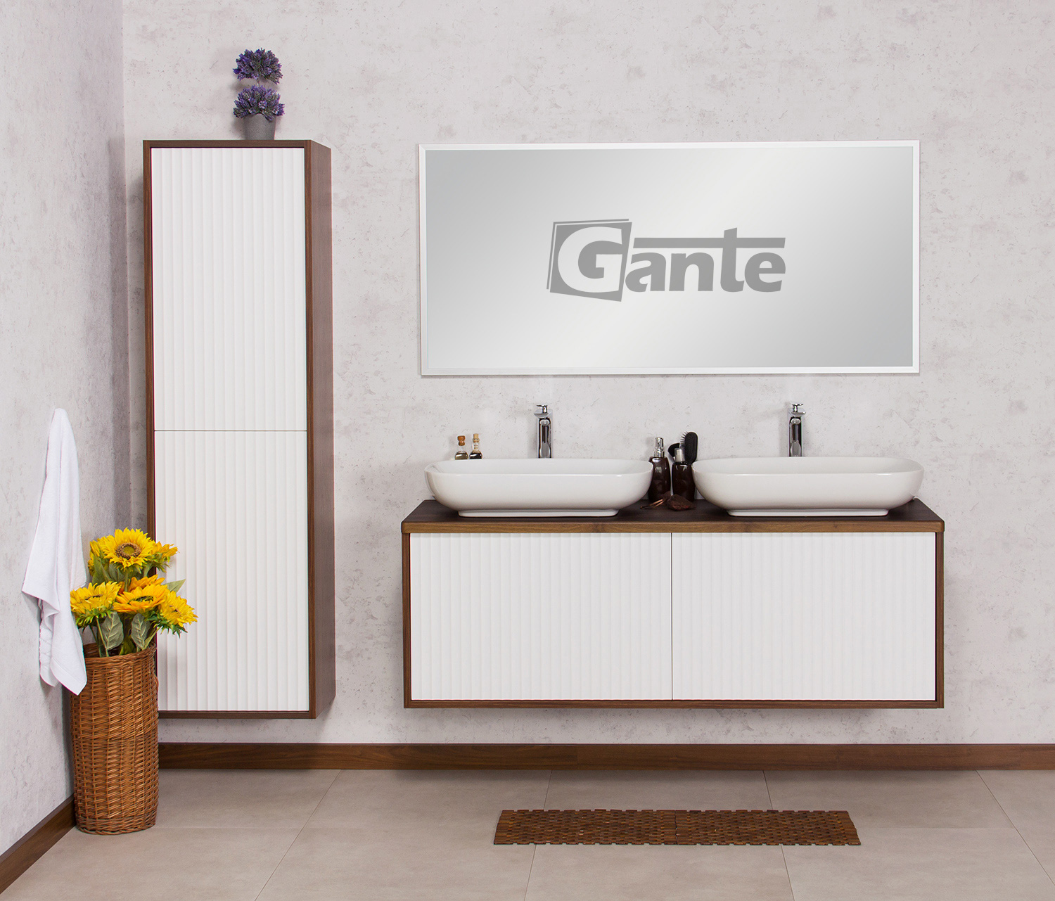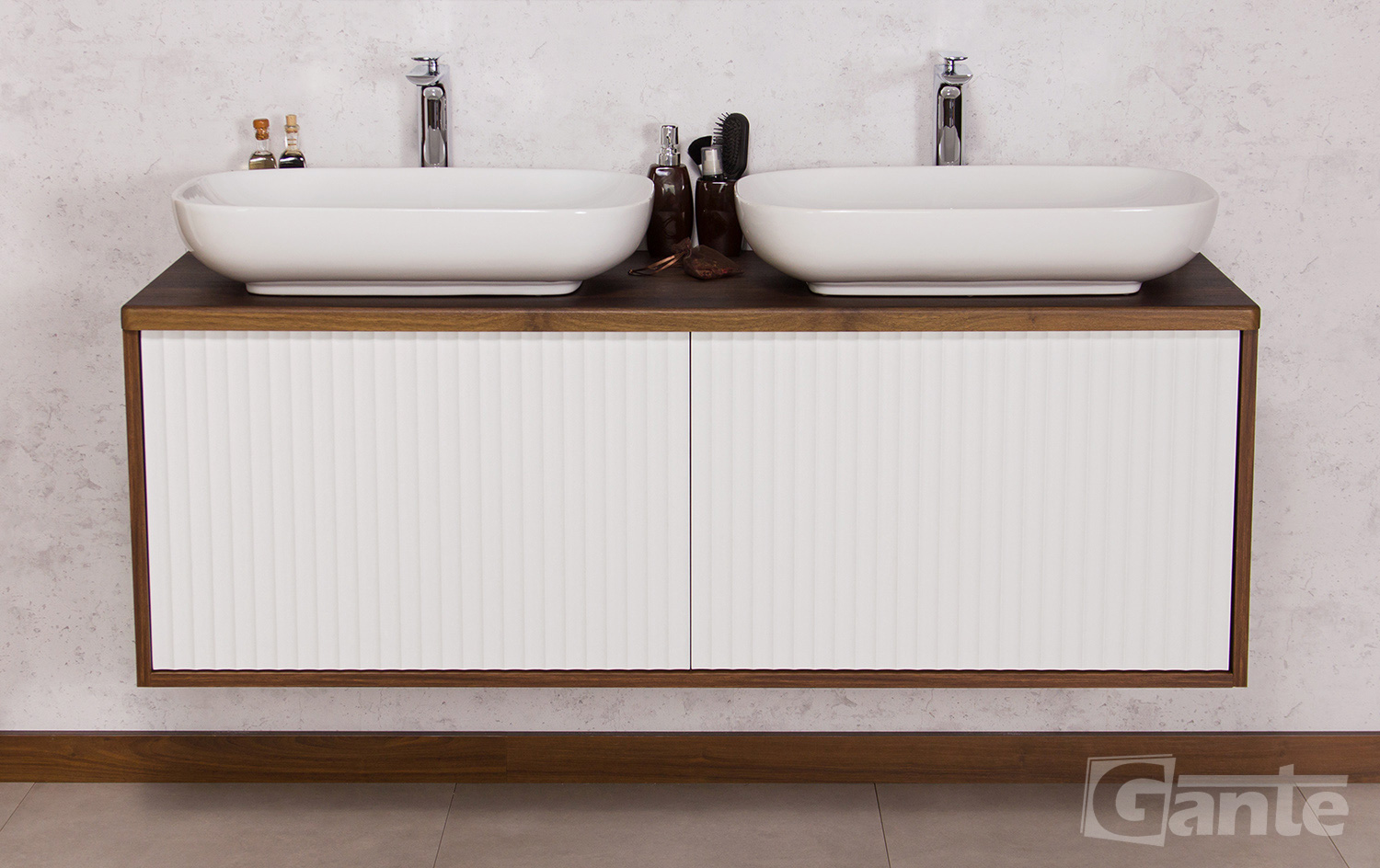 The line of bathroom furniture from the Venus collection is an excellent aesthetic combination of practicality and a modern finish. A special feature of this series is the bold colors combined in a contrasting way. The furniture bodies are available in two color variants: walnut and natural oak, while the fronts are in classic white, creating a warm and unique atmosphere. An additional advantage of this series are the delicate and streamlined slats that decorate the fronts. Decorative strips (lamellas), as we know, are a timeless trend that is a timeless decorative element and looks perfect in any modern bathroom. White countertop washbasins beautifully emphasize the simple shape of the furniture, creating a visually harmonious and matching set. A nod to modernity is the “push to open” opening system used in the entire series. The key advantage over traditional handles is the ability to open the furniture without using your hands, and in terms of aesthetics, it gives a minimalist look to the entire arrangement.
