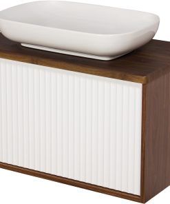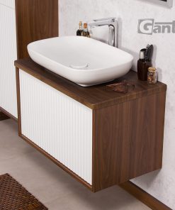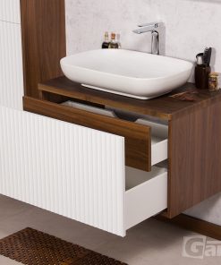 The line of bathroom furniture from the Venus collection is an excellent aesthetic combination of practicality and a modern finish. A special feature of this series is the bold colors combined in a contrasting way. The furniture bodies are available in two color variants: walnut and natural oak, while the fronts are in classic white, creating a warm and unique atmosphere. An additional advantage of this series are the delicate and streamlined slats that decorate the fronts. Decorative strips (lamellas), as we know, are a timeless trend that is a timeless decorative element and looks perfect in any modern bathroom. White countertop washbasins beautifully emphasize the simple shape of the furniture, creating a visually harmonious and matching set. A nod to modernity is the “push to open” opening system used in the entire series. The key advantage over traditional handles is the ability to open the furniture without using your hands, and in terms of aesthetics, it gives a minimalist look to the entire arrangement.